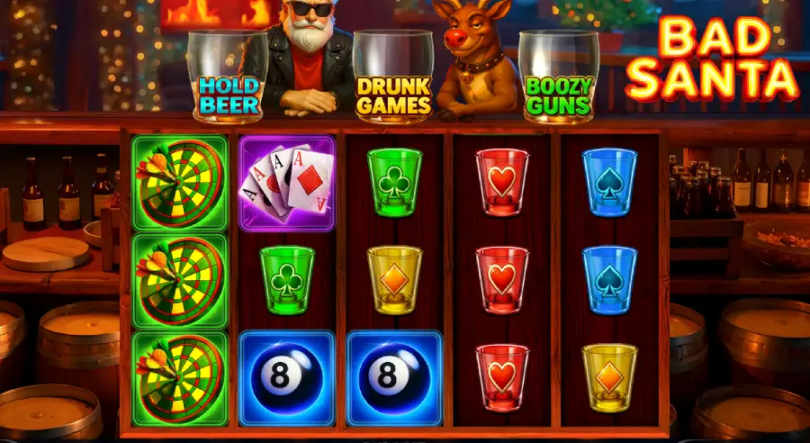 Bad Santa slot plants you at a five reel, three row bar counter where every spin dares the holiday rules. Wins land across 30 fixed paylines, with Santa acting as a Wild on reels two to five. Watch for Token bottles and the three drink symbols: Ale starts Drunk Games with 26 Free Games, Lager unlocks the Hold Beer Hold and Win board with four fixed jackpots, and Stout kicks off the Boozy Guns Pick Me bonus that can fire out prizes up to 500x.