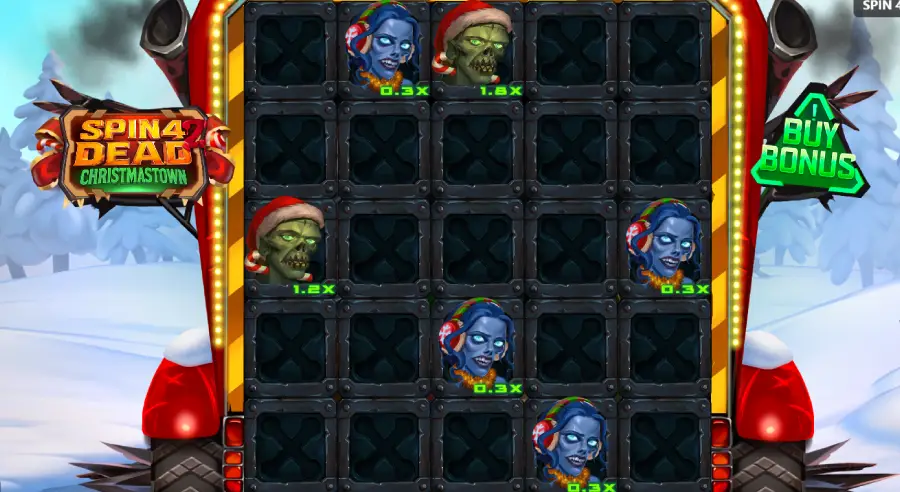 Spin 4 Dead 2 Christmastown plays like a tactical raid across a 5×5 field: each spin can summon your squad to strike the grid, clearing lines, blasting clusters, or sweeping the whole screen to cash in zombie values. Bonus and Super Bonus symbols can ignite a spin chain where every new drop keeps the firefight rolling. Want the action faster, turn on Double Chance or use Bonus Buy to jump straight into the carnage.