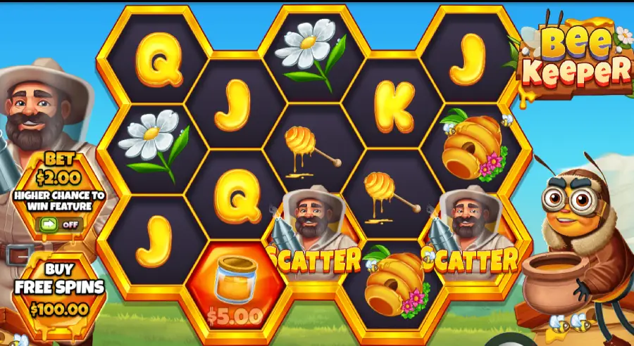 | Dive into a sunlit meadow full of buzzing wings in Bee Keeper by Pragmatic Play, where honey pots glisten, bee wilds collect money symbols, and free spins light up a progressive trail of honeypot multipliers—soaring toward 2,100× your bet under very high volatility with an RTP up to 96.53 %. |
