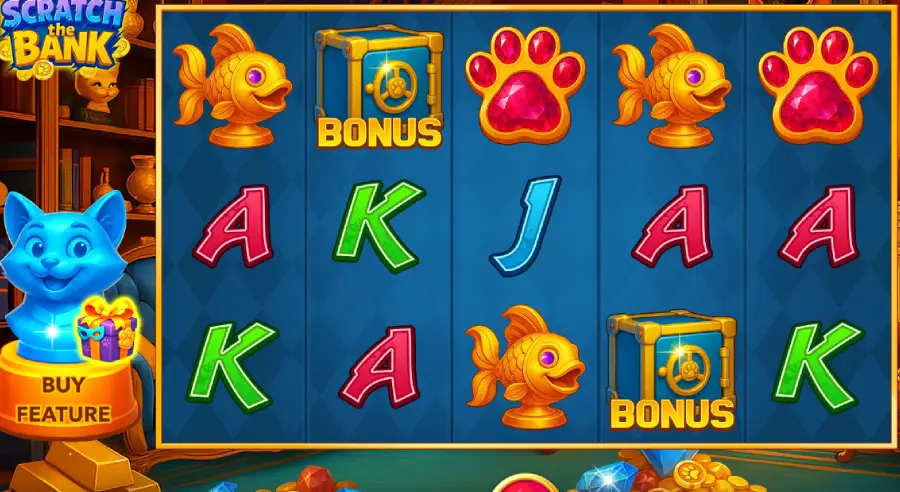 Scratch the Bank runs on a 5 reels × 3 rows layout with 243 ways to win. Wins trigger via matching symbols on adjacent reels. Bonus symbols unlock a vault-cracking pick game where safes hide cash prizes until a ‘stop’ symbol ends the round. Risk Game lets you gamble wins; Buy Feature allows direct access to bonus rounds.