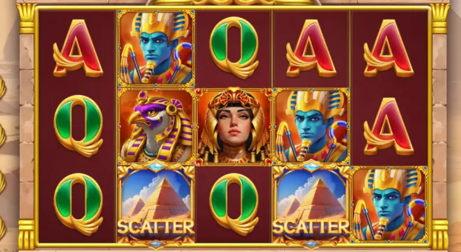 - Egyptian theme visuals: golden coins, pyramids, scarabs, sun over dunes.
