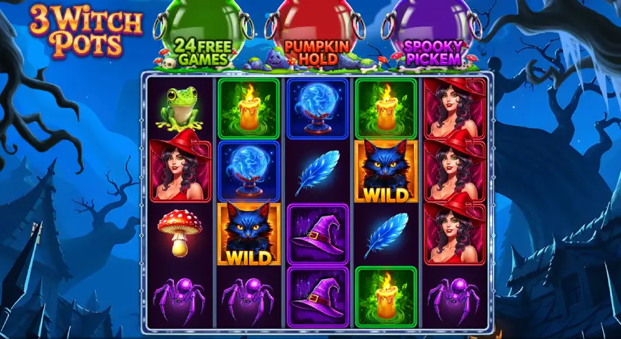 The coven spins on 5×4 reels with forty fixed lines. Green Elixir brews 24 Free Games with wilds active; Red Elixir stirs a Pumpkin Hold grid where jackpots can climb to an Ultra 1000x; Purple Elixir triggers a spooky Pick Me with escalating awards. Classic Risk Game lurks after wins for fearless double-or-nothing climbs.