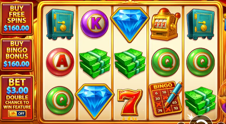 Spins begin on a 5×3 grid with 30 ways to connect. Land six or more bingo symbols and the reels unfold into a 5×5 board where coins stick, lines fuse values into the center, and multipliers amplify totals before payout. Free spins start at six, with mystery tiles revealing wilds or extra bingo hits to spark the bonus again.