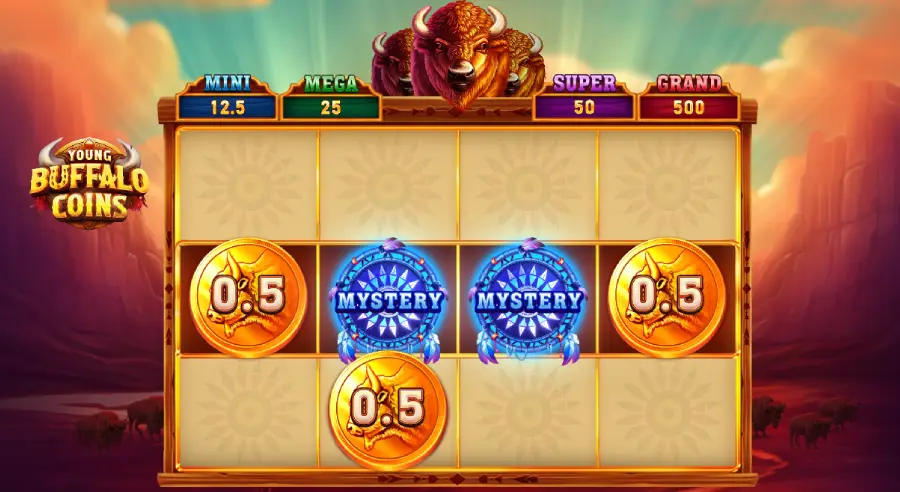 Action centers on a 4×3 setup where four symbols in the middle row spark the Bonus Game. You start with three respins, refreshed by every new coin. Sticky coins can park from base to bonus, Collector buffalos gather all values, Mystery symbols settle at the end, and Buffalo Spirit rains x2 to x12 multipliers. Bonus Buy lets you leap straight into the heat.