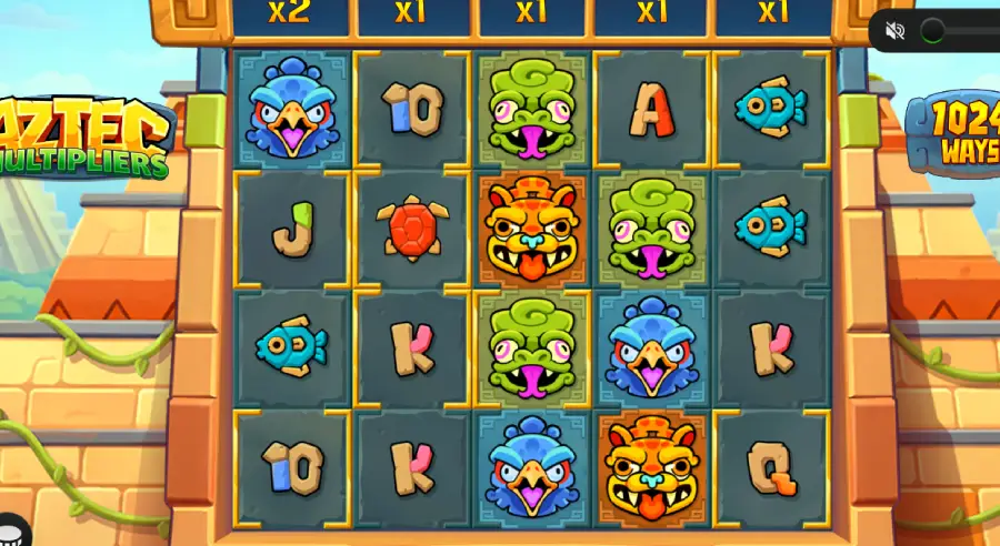 Aztec Multipliers plays on a 5×4 reel setup with 1,024 ways, sending carved idols, relics, and sacred emblems into cascading combinations. The core thrill comes from glowing golden frames and reel multipliers above the grid, where winning symbols can ignite escalating values that keep building as the jungle rhythm intensifies.