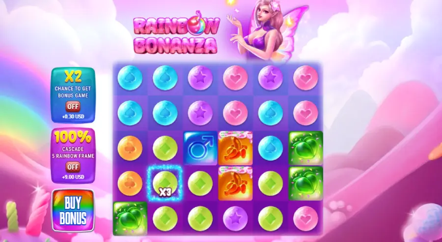 Rainbow Bonanza runs on a 6×5 Pay Anywhere grid, so wins form by matching symbols across the screen instead of fixed lines. Winning clusters trigger avalanche cascades, refilling the grid and letting multipliers flare up mid run. Land Scatters to enter Free Spins, or use Bonus Buy paths to fast travel into the bonus hunt.