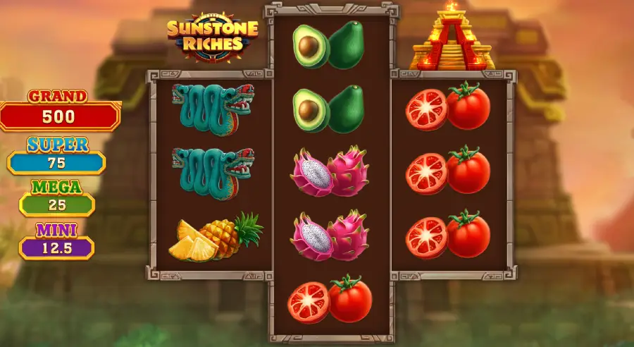 Sunstone Riches keeps the base game sharp and fast: spin for wins, and watch for Bonus symbols on reels one and three with a Sun-Bonus on reel two to awaken the temple. The Bonus Game begins with three respins, resets whenever new symbols land, and locks Sun-Bonus in place while Bonus values flow into them for a growing final payout.